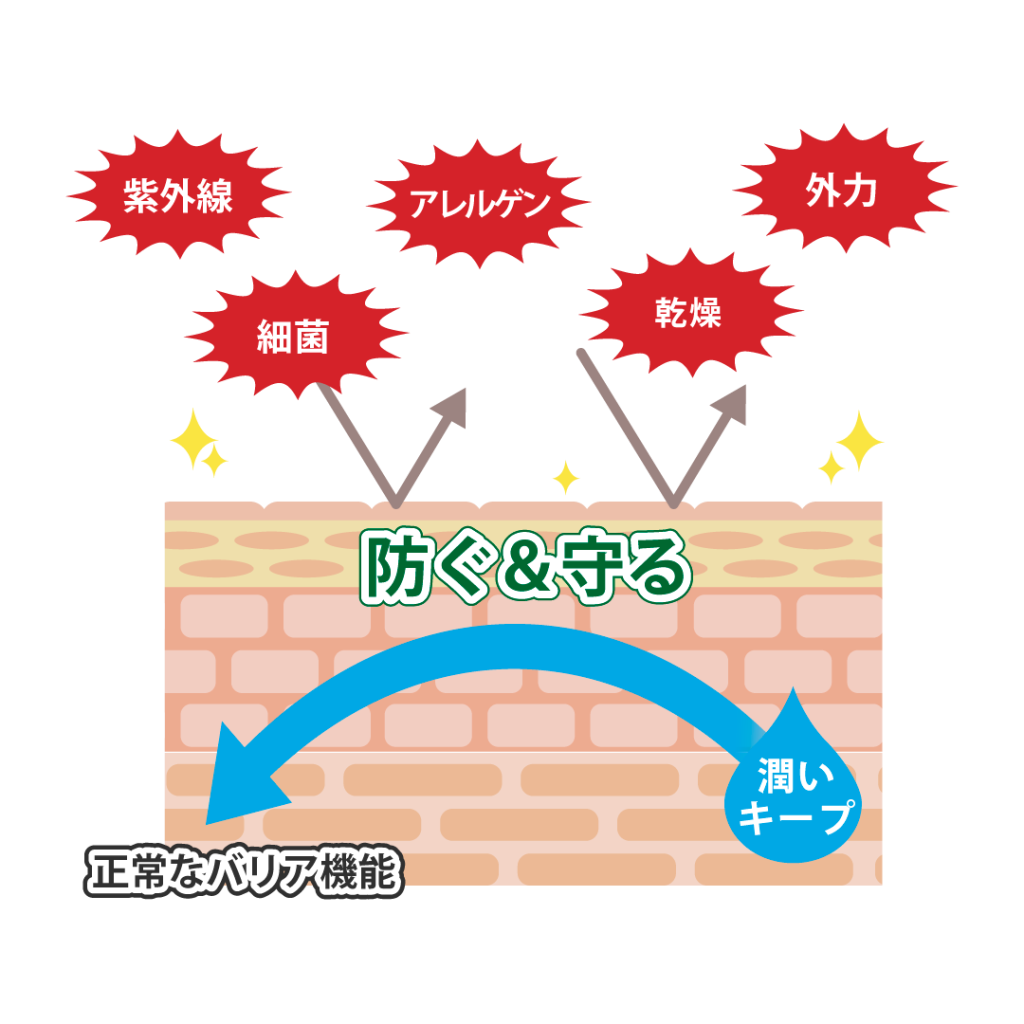 このバリア機能が正常に働いていることで、皮膚は潤いを保ち、外部の刺激からお肌を守れます。