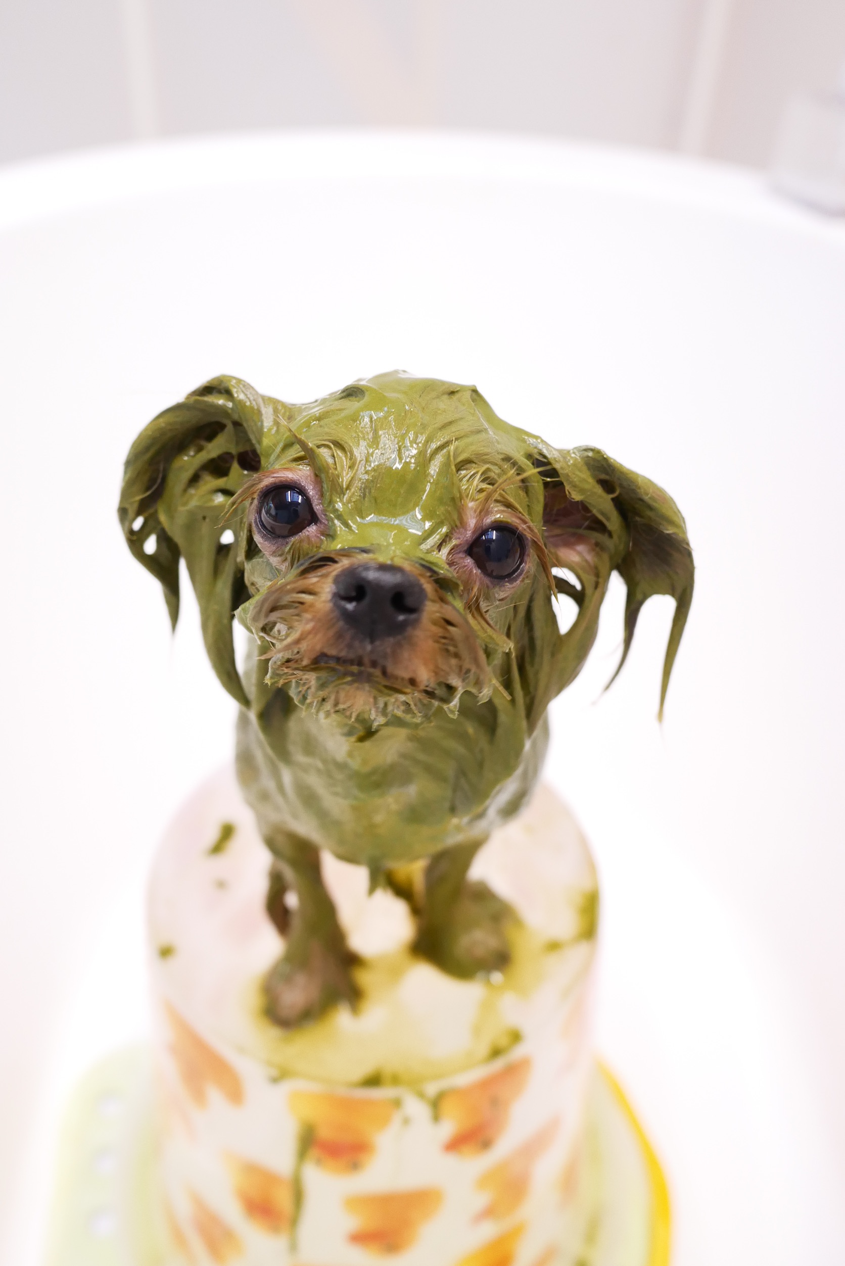 ワンコの皮膚・被毛の状態に合わせて、ハーブパックをブレンドして使いました。ビューティーオイルが被毛一本一本をコーティングして、しっとりツヤツヤです。ビューティとドクターズをブレンドしてお肌と被毛にアプローチ!